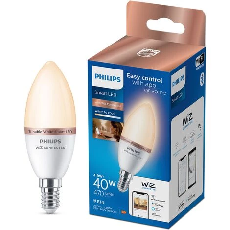 Cette ampoule LED intelligente Philips convient aux lampes dotées d’un culot E27. La source lumineuse en forme de bougie de 4,9 watts fournit une lumière blanche réglable avec un rendement lumineux de 470 lumens. La source lumineuse a une durée de vie allant jusqu’à 15 000 heures et un diamètre de 3,9 centimètres. Vous pouvez contrôler la lampe avec l’application Wiz via votre réseau Wi-Fi ou par la voix. Elle répond également aux exigences EyeComfort, ce qui signifie que la lumière est agréable pour les yeux. Vous recherchez d’autres éclairages intelligents Philips ? Découvrez la gamme dans nos magasins Brico et BricoPlanit ou en ligne.