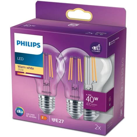 Cette ampoule de Philips convient pour des luminaires à douille E27 et possède un diamètre de 6 cm. L’ampoule LED de 4,3 watts produit une lumière blanche chaude. Elle possède une durée de vie de 15.000 heures. Cette ampoule à intensité variable est idéale pour les lampes connectées à un variateur. Les ampoules sont vendues par deux.