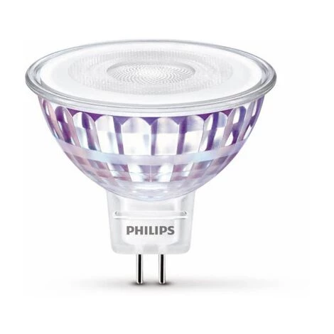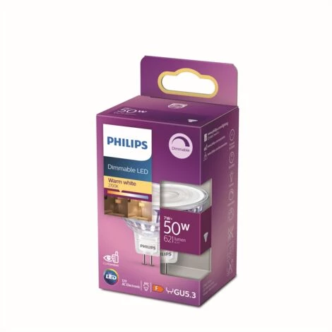 Cette lampe de Philips convient pour des luminaires à douille GU5.3 et possède un diamètre de 5,05 cm. La lampe LED de 7 watts qui diffuse une lumière blanche chaude de 621 lumens, possède une durée de vie de 15000 heures. Cette lampe à intensité variable est idéale pour les luminaires connectés à un variateur.