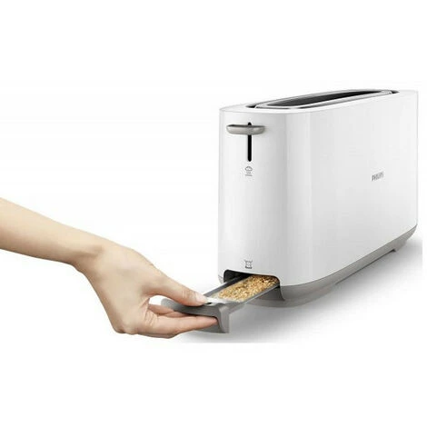 Un grille-pain à fente longue Philips HD2590/00 offrant 8 niveaux de dorage, pour du pain uniformément grillé à votre convenance, quels que soient son type et vos goûts. L’accessoire réchauffe-viennoiseries intégré est adapté à tous types de produits, du petit pain au croissant.Design à fente longueLa fente longue unique s’adapte à presque tous les types de pains.8 niveaux de dorageRéglez la durée de fonctionnement, pour un pain grillé comme vous l’aimez.Mode de décongélationLe mode de décongélation permet de griller directement du pain congelé en toute simplicité, d’une simple pression sur un bouton.Réchauffe-viennoiseries intégréLe réchauffe-viennoiseries intégré réchauffe les pâtisseries, petits pains, croissants, etc.Levier de surélevageLe levier de surélevage permet de relever les petites tranches afin de les retirer facilement et en toute sécurité.Tiroir ramasse-miettes amovibleFacile à nettoyer grâce au ramasse-miettes amovible.Mode de réchauffageLe mode de réchauffage permet de réchauffer du pain déjà grillé en quelques secondes, d’une simple pression sur un bouton.Parois froidesLes parois sont isolées, et restent donc toujours froides au toucher.
