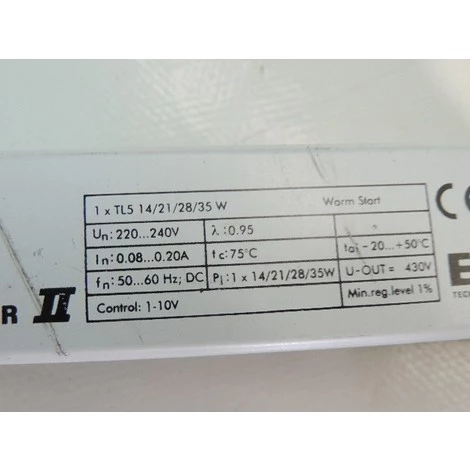 Ballast électronique haute fréquence pour la gradation, utilisant le protocole analogique (1-10 V) pour lampes TL5 HE/HO et TL5 Eco Ballasts électroniques à régulation sous 1-10V haute fréquence. La puissance de la lampe peut être graduée jusqu’à 3%. Amorçage à chaud sans clignotement. Classification de l’efficacité é