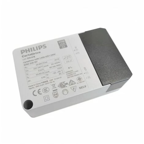 Transformateur de la marque Philips, adapté pour une utilisation avec un pavé LED, d’une puissance maximum de 44 watts.