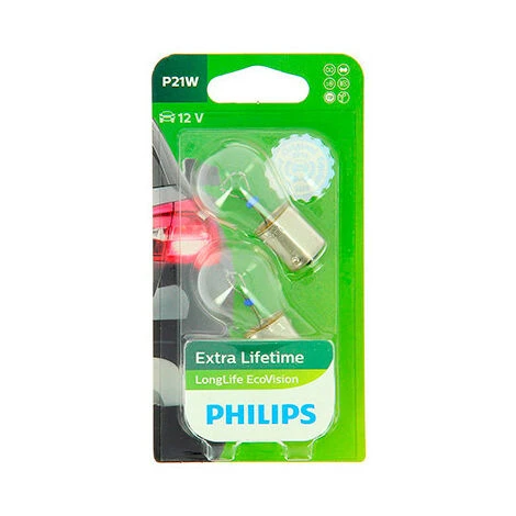 - Éclairage automobile : 2 Ampoules Extra lifetime P21W – 12 V – BA15s – 21W – Clignotant – Stop – Feux de route – Antibrouillard – De recul – Philips