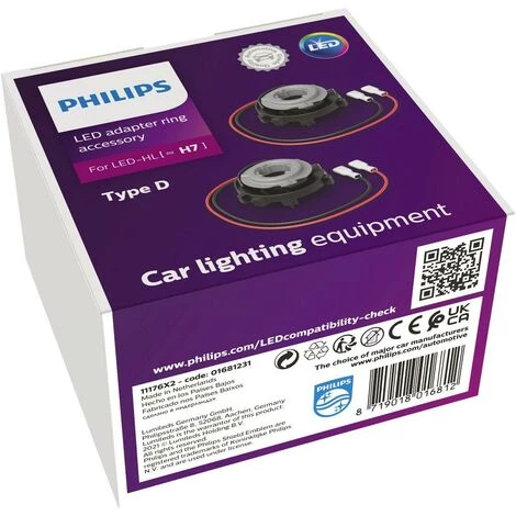 - Anneaux adaptateurs LED H7 pour un maintien précis et une installation simple de la LED Philips Ultinon Pro6000 H7 Consultez la liste de compatibilité des LED Philips Ultinon Pro6000 à l’adresse philips.de/LED-Strassenzulassung** et vérifiez si des accessoires supplémentaires sont nécessaires pour l’installation dans votre modèle de véhicule Approuvé par l’Office fédéral de la circulation automobile (KBA) pour une utilisation sur la route publique pour certains modèles de véhicules Les anneaux adaptateurs LED Philips sont fabriqués à partir de matériaux durables et résistent à de grandes charges physiques et thermiques. »